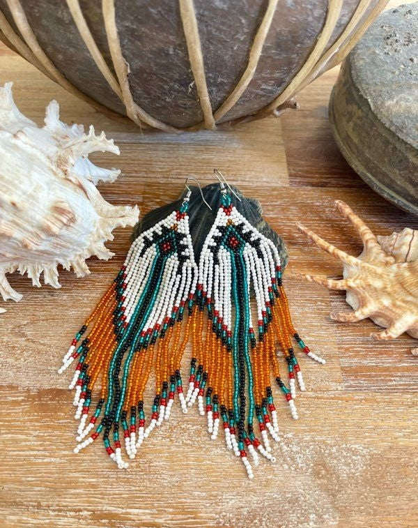 Boucles d’oreilles bohémiennes amérindiennes perlées à la main – Bijoux de cérémonie rustiques en perles et cristaux rétro